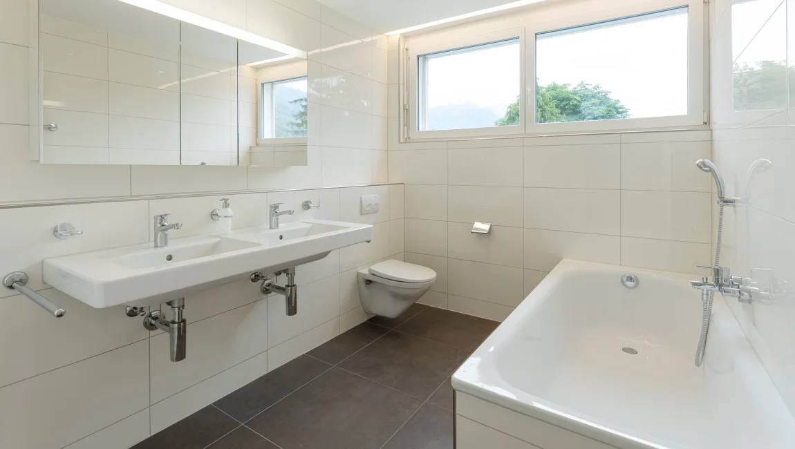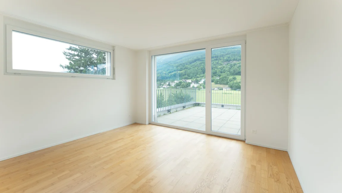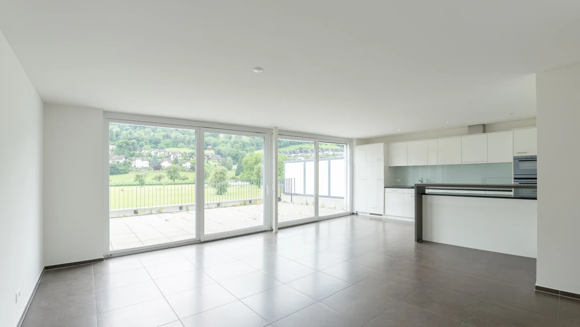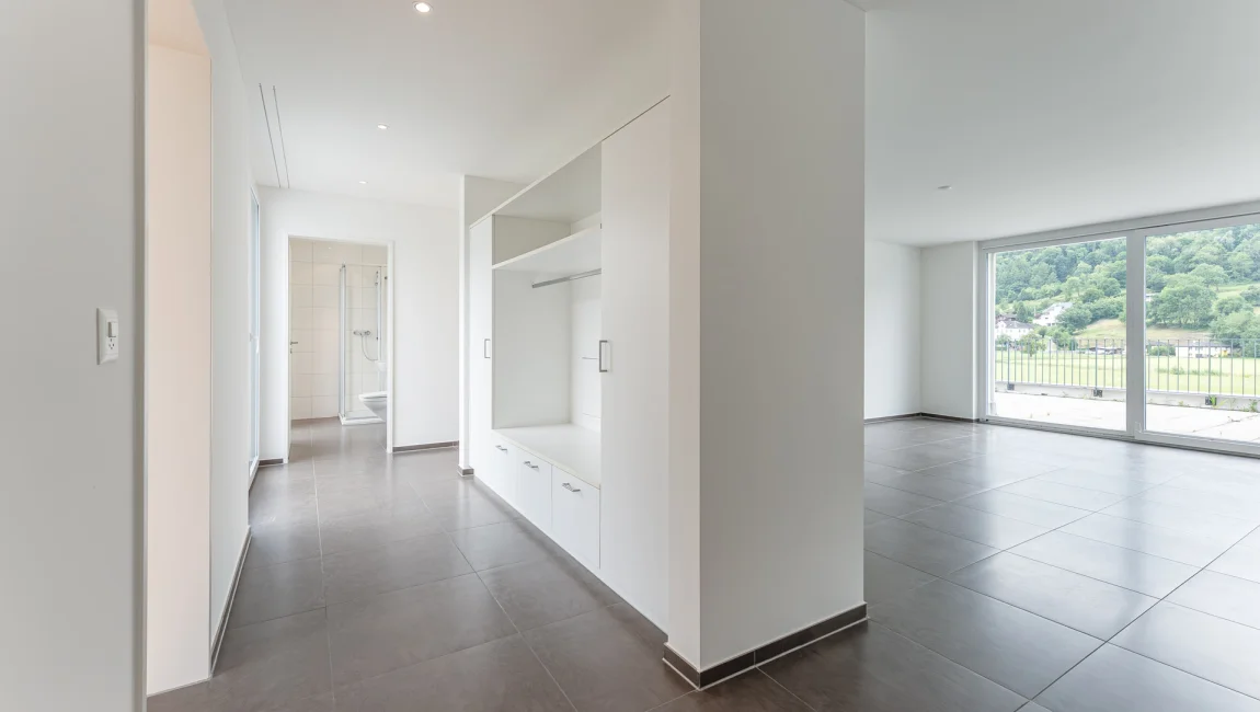 Die Wohnungen verfügen über elegante Plattenböden im Wohnzimmer und stilvolle Parkettböden in den Schlafzimmern, was für eine angenehme und warme Atmosphäre sorgt. Zudem bietet jede Wohnung ein praktisches Reduit mit einer eigenen Waschmaschine und einem Tumbler – ein zusätzlicher Komfort, der den Alltag erleichtert. Ein weiteres Highlight ist die einzigartige, unverbaute Aussicht, die von den Wohnungen genossen werden kann. Diese sorgt nicht nur für einen tollen Blick auf die Umgebung, sondern trägt auch zur attraktiven Wohnqualität bei.